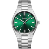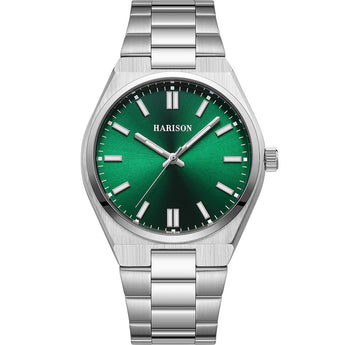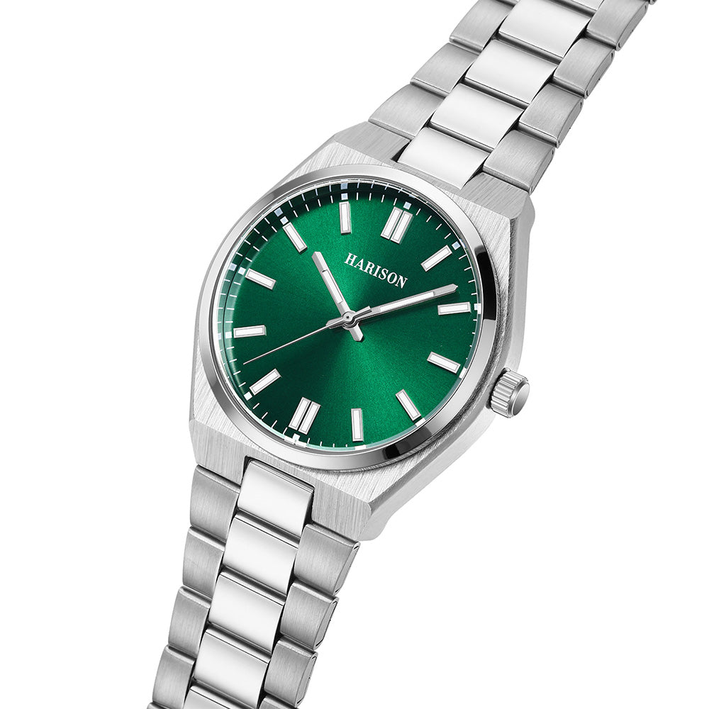 This 42mm stainless steel watch features a sleek silver case with a slim 10.5mm profile, paired with a rich dark green sunray dial for a bold yet refined look. The matching stainless-steel bracelet adds durability and a classic finish. Powered by reliable Japanese movement and protected by mineral glass, this timepiece is also water resistant up to 30 meters — making it a stylish and practical choice for everyday wear.