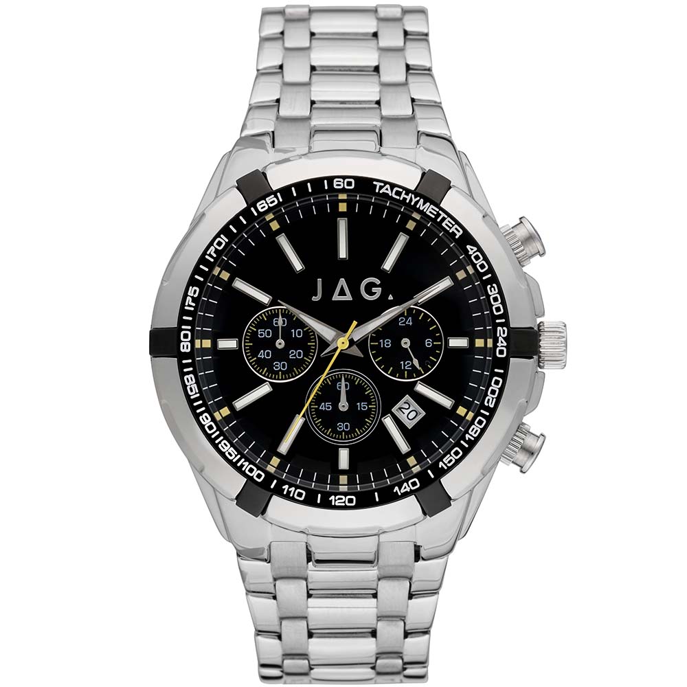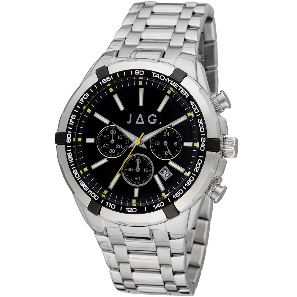 Introducing the Jag Boss J2396A Chronograph, where precision meets style in a robust design. This striking timepiece features a silver-tone stainless steel case and bracelet, offering durability and a sleek aesthetic. The black dial enhances readability and contrasts elegantly with the silver accents, embodying a sophisticated yet sporty appeal. Powered by reliable quartz chronograph movement, it ensures accurate timekeeping with additional stopwatch functionality for precise timing. The 46mm case size provides a bold presence on the wrist, making a statement suitable for various occasions. With a strap width of 26mm, it offers a comfortable fit while maintaining a substantial look. Protected by mineral crystal, the watch ensures durability and clarity against daily wear. While water-resistant up to 30 meters, it is suitable for everyday wear, offering resistance to splashes and brief immersion in water. Ideal for those who appreciate both functionality and style, the Jag Boss J2396A Chronograph is a versatile companion for both professional environments and leisure activities.