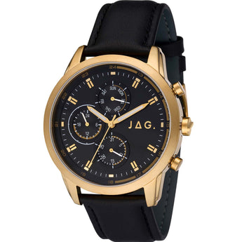 A staple piece, this Jag J2530 Kennedy Mens Watch has sophisticated features that make the watch feel complete. The leather band gives the watch a sense of elegance and versatility while the case is crafted in the warm tones of gold plated stainless steel. The contrast between black and gold is a classic and timeless look that will not be outdated. Complete with a chronograph, three hands and the iconic Jag logo, you can step out each day in style with this piece.