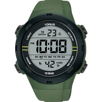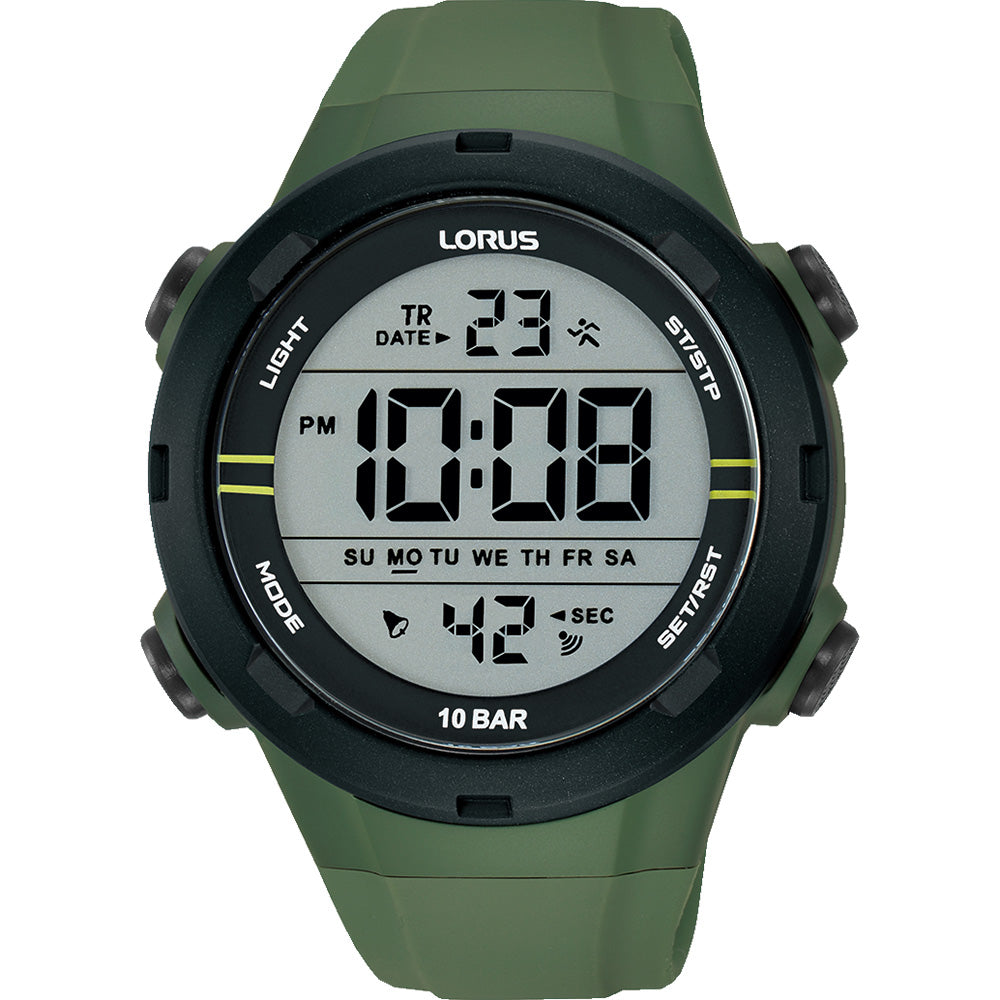 Powered by a precise quartz movement, this watch has a durable 46mm case crafted from plastic and stainless steel. It includes acrylic glass, a pull-out crown, and calendar indicators showing the date, day of the week, and month. The countdown timer can be set up to 23 hours and 59 minutes, while the stopwatch measures up to 23 hours, 59 minutes, and 59 seconds in 1/100th of a second increments with split/lap functionality. Water resistant up to 100 meters, it’s designed for both performance and everyday wear.