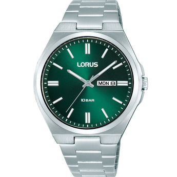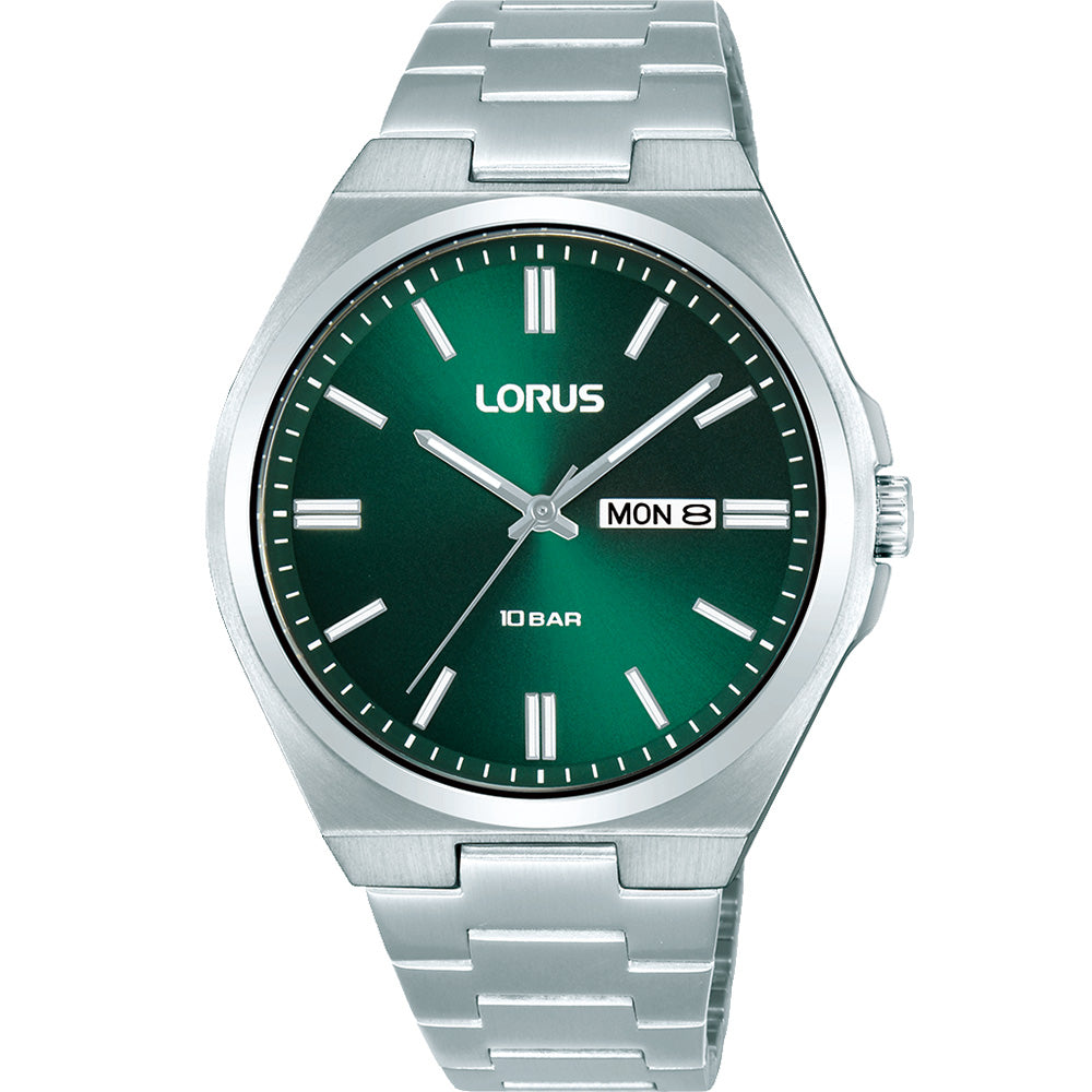 Powered by a dependable quartz movement, this watch has a bold 40mm case size and is protected by durable mineral crystal. It includes a practical pull-out crown, a day/date display for everyday convenience, and offers 100 meters of water resistance—making it perfect for both active wear and casual styling.