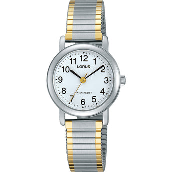Introducing the Lorus RRX05HX-9 Quartz, a stylish and practical timepiece designed for everyday wear. This watch features a silver-tone case paired with a crisp white dial, offering a classic and versatile appearance suitable for any occasion. Powered by the Calibre No. Y121 quartz movement, it ensures precise timekeeping with the convenience of battery operation, providing approximately 2 years of battery life for reliable performance. The 26mm case size provides a compact and comfortable fit on the wrist, ideal for those who prefer a smaller watch profile. Protected by mineral crystal, the watch face maintains clarity and durability against daily wear. The two-tone silver and gold striped expansion bracelet enhances the watch's aesthetic appeal while offering flexibility and ease of wear, adapting comfortably to wrist size. While specifics on water resistance are not detailed, it's designed to withstand occasional splashes and moisture exposure typical for everyday use. Perfect for individuals seeking a blend of style and functionality, the Lorus RRX05HX-9 Quartz is a dependable choice that complements any attire with its timeless design and practical features.