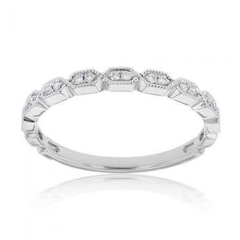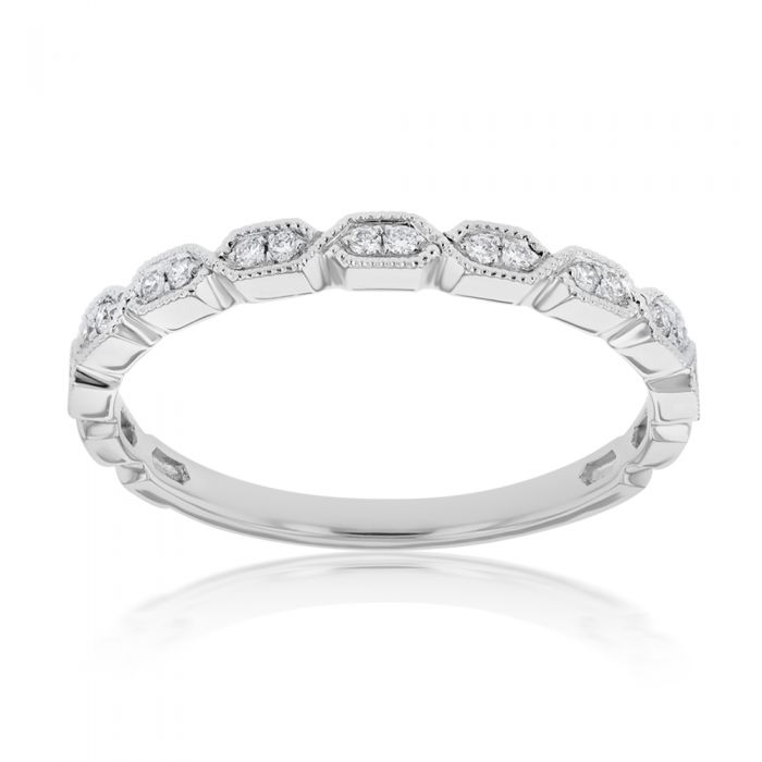 Memoire 18ct White Gold Vintage Round and Flat Hexagon Stack Ring with 18 Diamonds
