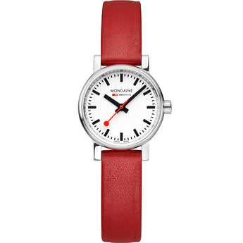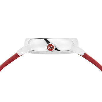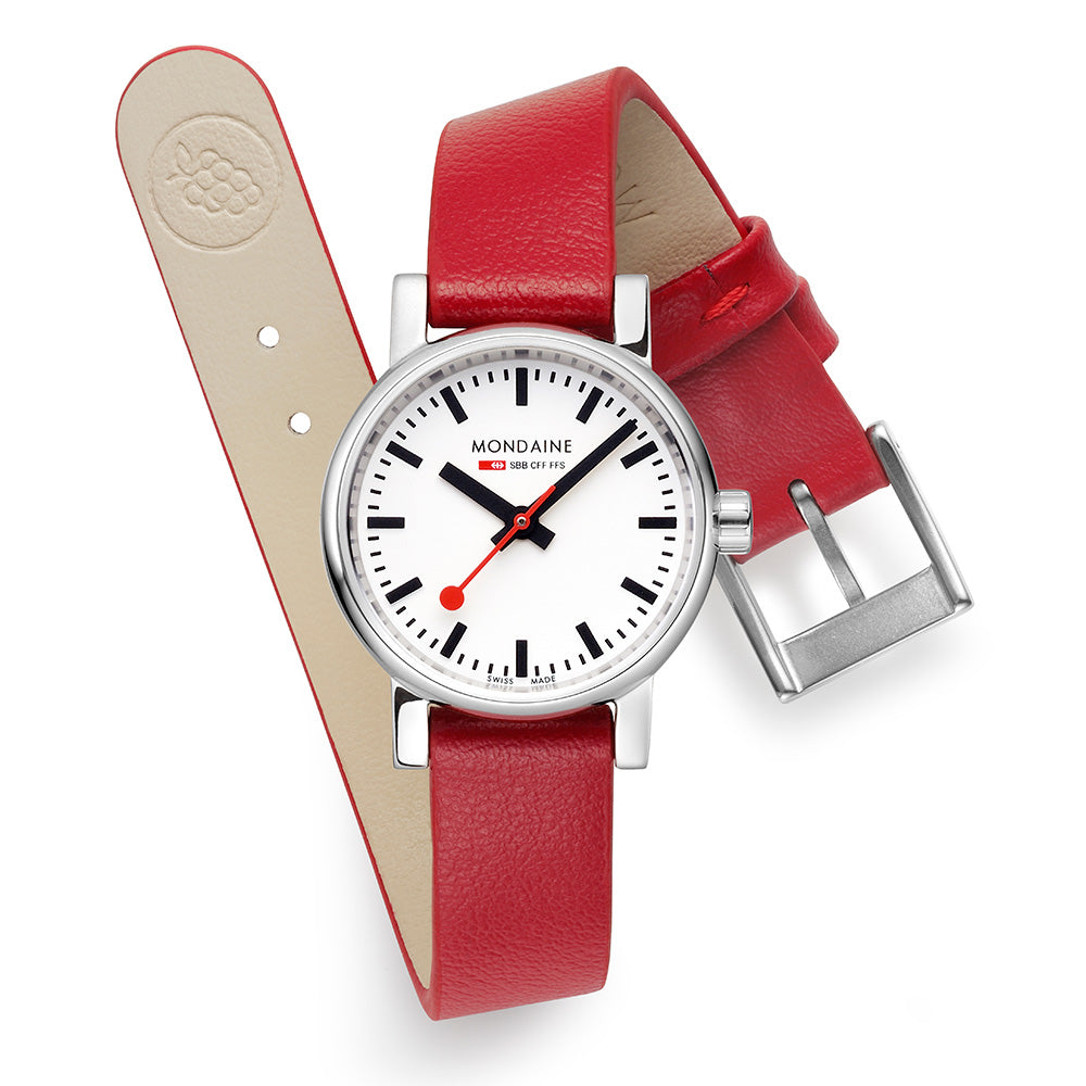 The Mondaine evo2 boasts a meticulously crafted polished stainless-steel case measuring 26mm in diameter, ideal for small and delicate wrists, ensuring exceptional comfort. Safeguarded by sapphire crystal, the watch features an iconic dial accentuated by a prominent red second hand, offering superb readability with its minimalist design. Highlighting Mondaine's expertise are the ergonomic red crown and the accompanying vegan grape leather strap in red, comprising 75% eco-friendly plant-based composite material and 25% recycled PET.