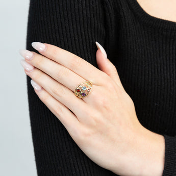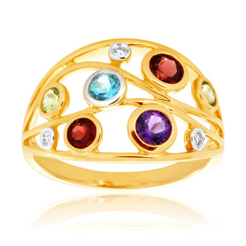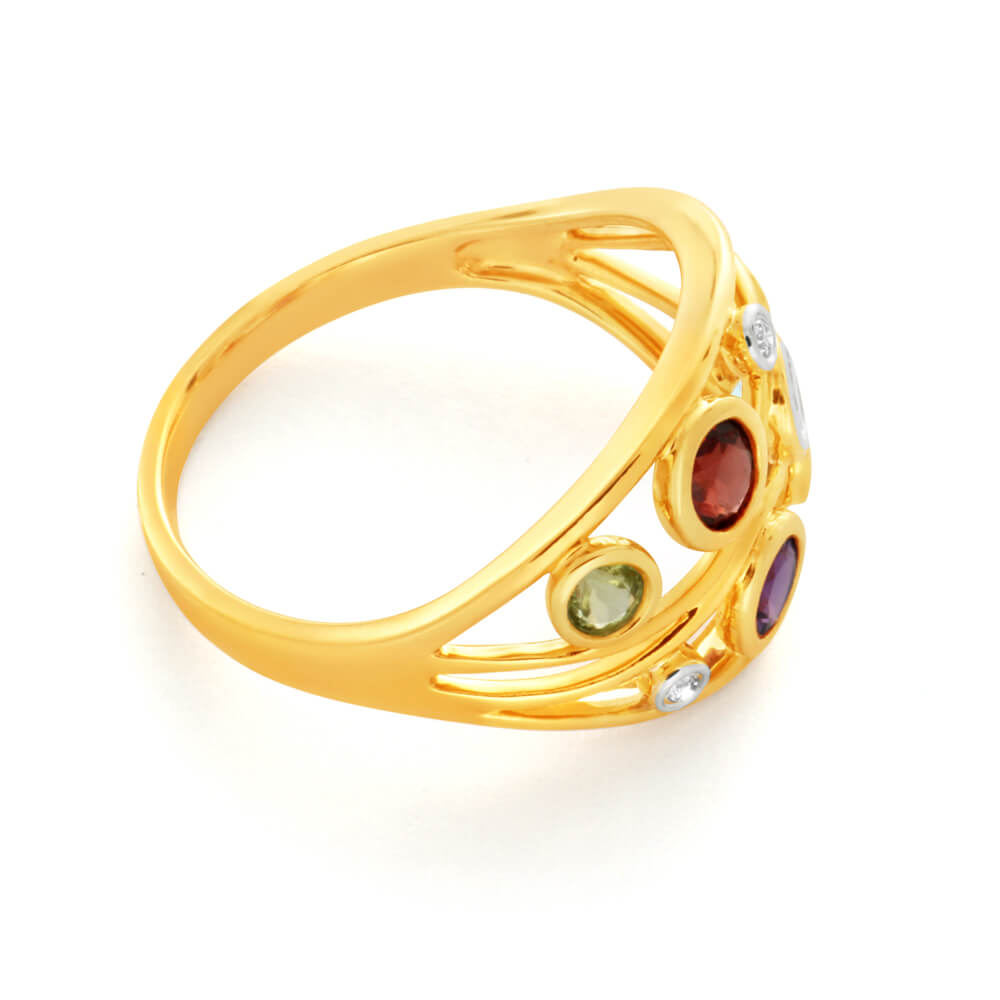 Natural Amethyst, Blue Topaz, Garnet, Peridot & Diamond Ring in 9ct Yellow Gold
