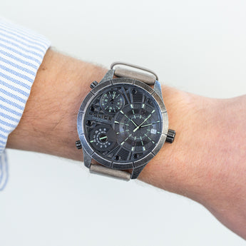 This timepiece operates on Quartz Movement, features a chronograph function, and boasts a substantial 52mm case size. Encased in stainless steel, it is complemented by a durable leather band. With a water resistance of 50 meters, it withstands everyday challenges with ease.