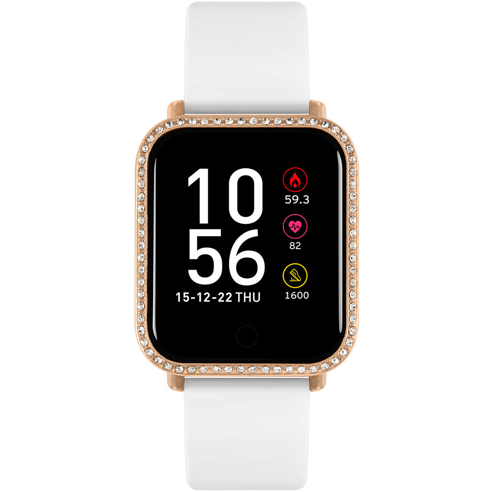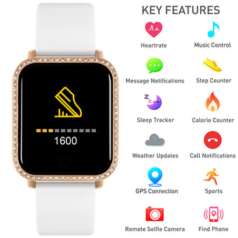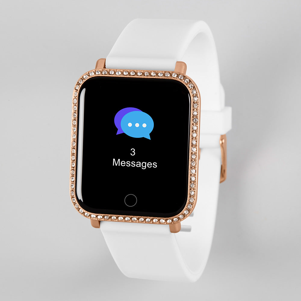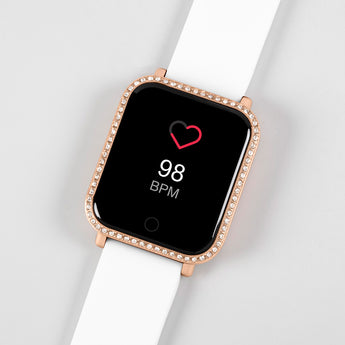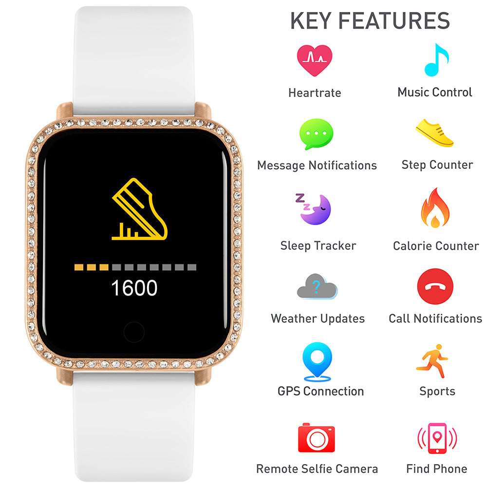 Our elegant Series 06 smartwatches are equipped with premium functionalities to effortlessly monitor your fitness progress through our user-friendly app. Notable features include a vibrant colour touchscreen, activity tracking, step counter, remote camera access, sleep monitoring, calorie tracking, weather updates, find my phone feature, alarms, call alerts, message notifications, and more. Additionally, enjoy added benefits like the heart rate monitor and music control. Adorned with a soft silicone band and a beautifully embellished crystal case, these watches offer both style and substance.