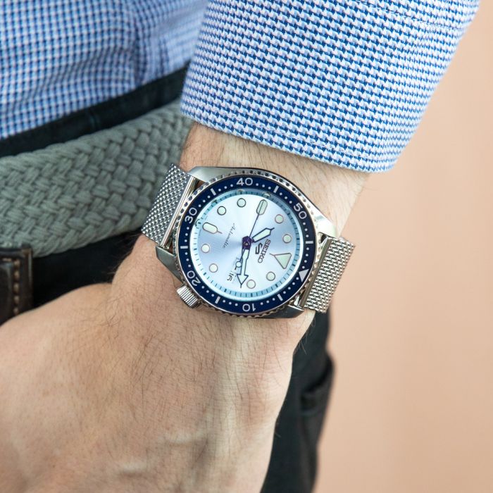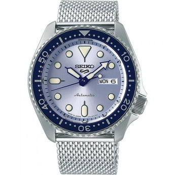 Seiko 5 Sports Mens Stainless Steel Case and Mesh Bracelet Automatic Movement Watch SRPE77K. The Stainless Steel case is offset by the glossy icy blue face with Day & Date functionality and lumibrite hands and markers.
