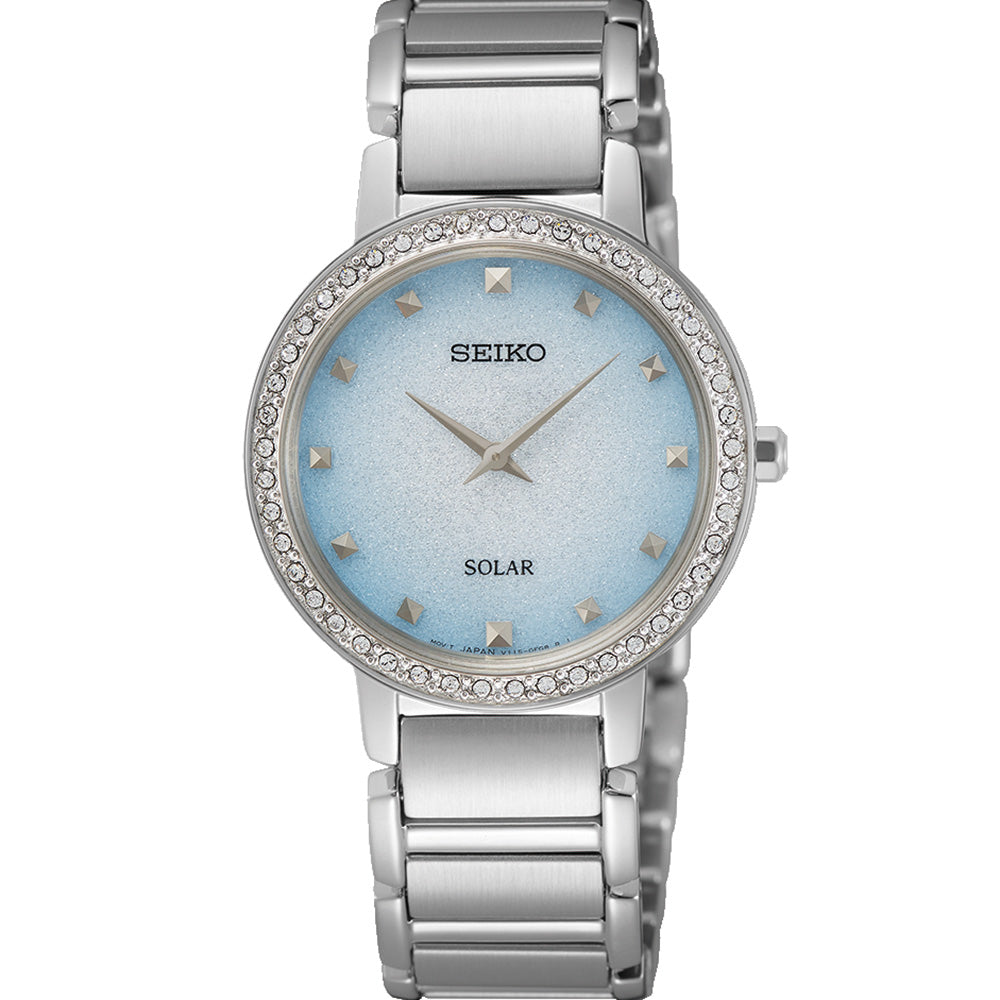 Powered by the efficient Caliber V115 solar movement, the watch operates using energy from any light source, providing uninterrupted functionality without the need for battery changes. Its stainless-steel case and bracelet exude sophistication, while curved Hardlex glass protects the dial from scratches and maintains clarity over time. Additionally, the watch includes an overcharge prevention function to optimize battery lifespan.
