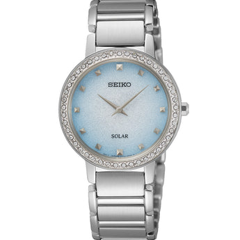 Fitted in durable stainless steel, this timepiece boasts a sleek design that rests comfortably on the wrist, featuring a thinner band ideal for smaller wrists. The dial, measuring a modest 30.5mm, is adorned with a delightful light blue hue and subtle texture, offering a refreshing accent to any attire. Sparkling crystals embellish the bezel, enhancing its visual appeal alongside silver indices that ensure easy time reading.