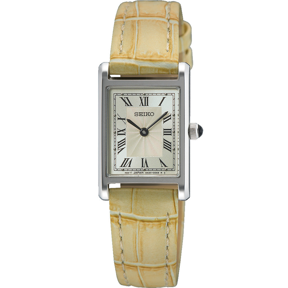 Powered by the Calibre 4N30 quartz movement, this watch operates with battery precision, offering an accuracy of +/-15 seconds per month within a normal temperature range of 10°C to 60°C. It is equipped with hardlex glass to protect the dial, a cabochon pull-out crown for easy adjustments, and boasts water resistance up to 30 meters.