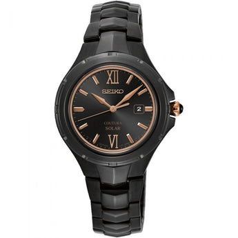 The Seiko Coutura SUT378P Solar Watch, a sophisticated blend of style and precision. Powered by any light source, it boasts the reliable Caliber No. V137, ensuring accurate timekeeping with a deviation of just +/-15 seconds per month within the normal temperature range. With a 6-month power reserve, this watch ensures uninterrupted performance. Its sleek 29mm case size and slim 7.7mm thickness offer a refined presence on the wrist, while the stainless-steel case and bracelet exude durability and elegance. The sapphire crystal provides exceptional scratch resistance, ensuring long-lasting clarity. Equipped with a pull-out crown for easy adjustments and featuring a date display for added functionality, this watch is perfect for daily wear. With water resistance up to 100 meters, it's ready to accompany you on any adventure, making it a stylish and reliable choice for discerning individuals.