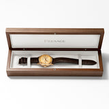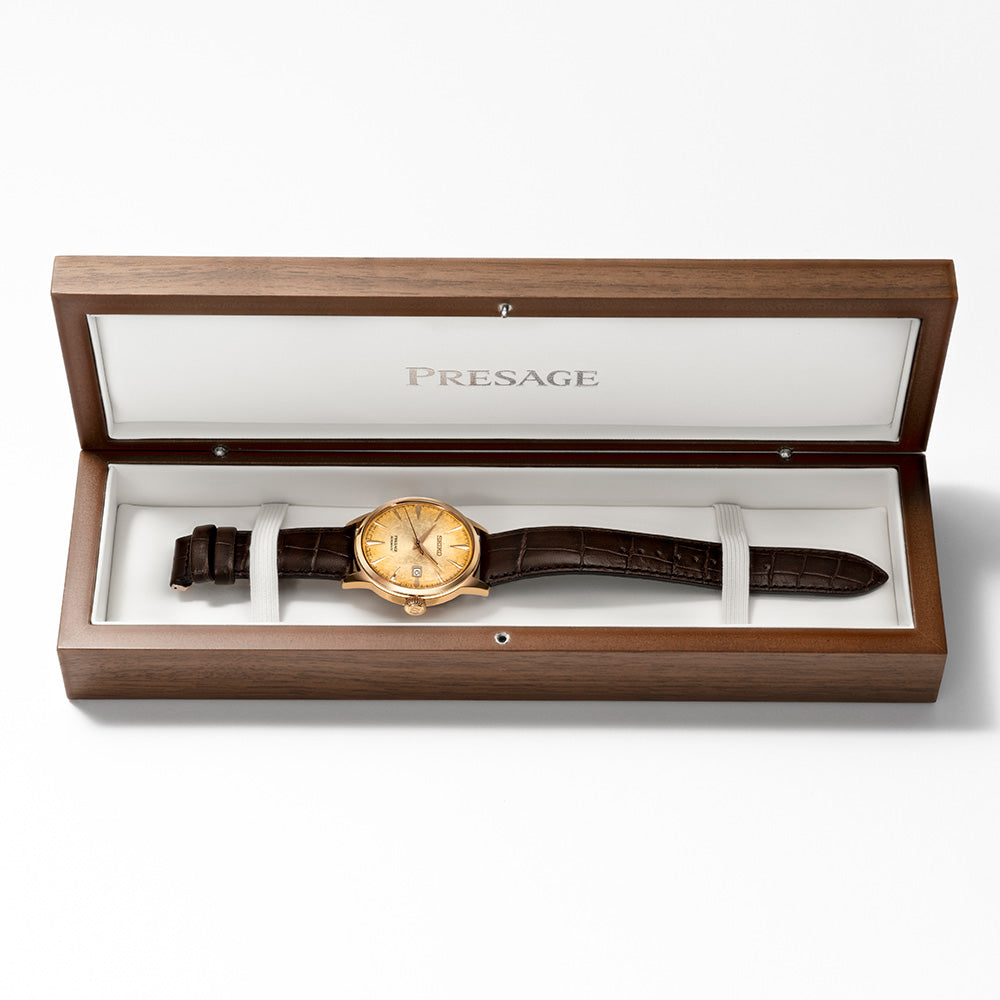 style of a cocktail glass with the watch packaged in a “whisky barrel” timber look box.