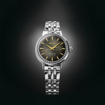 The ladies' limited edition SRPE15J is a tribute to the 'Night Time Tokyo' cocktail, crafted by master bartender Hisashi Kishi, a celebrated figure in the world of mixology.