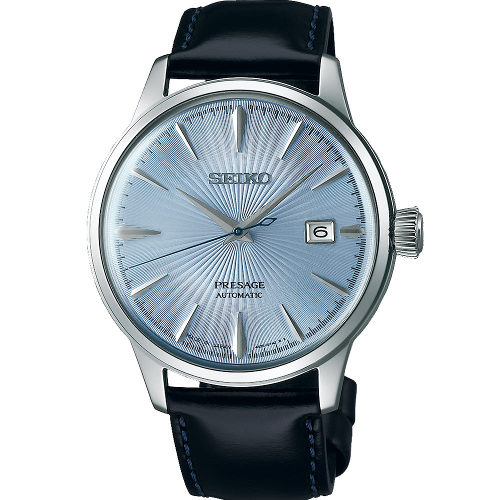 Introducing the "SKYDIVING", named after the cocktail of the same name. With an ice blue sunray dial and a date window, this timepiece boasts a 40.5mm stainless steel case and a leather band. Made in Japan, it features a domed "Hardlex" mineral crystal, an exhibition case-back, and an automatic movement with a 41-hour power reserve. With water resistance up to 50 meters, it combines sophistication with functionality effortlessly.