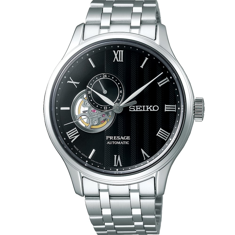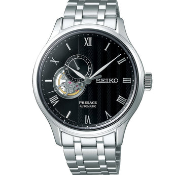 The Seiko "Garden" Presage automatic Men's watch is an ideal choice for every occasion. Boasting a stainless-steel case paired with a black dial, it exudes timeless elegance. The classic dial design showcases a refined pattern and is adorned with silver Roman numeral markers for a sophisticated touch.