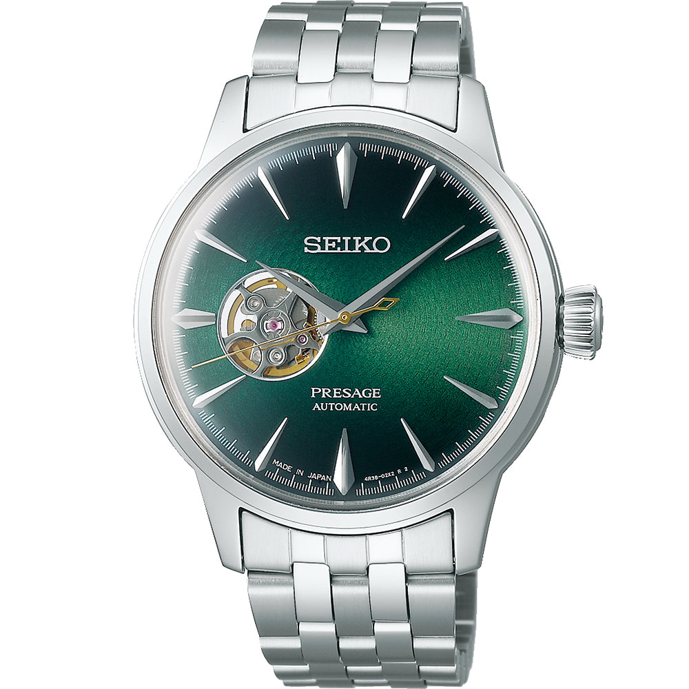 Enhanced by a box shape hardlex glass and a three-fold push button release clasp, this watch boasts a water resistance rating of 50m. Additional features include a screw case back, exhibition case back, and an open-heart movement, allowing glimpses of its intricate mechanics. The textured sunburst green dial, stainless steel hands and markers, and the captivating open-heart movement combine to create a striking visual contrast, epitomizing the elegance and craftsmanship of Seiko Presage.