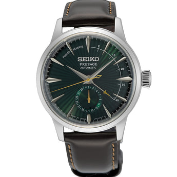 The Seiko Presage Cocktail Time collection embodies over a century of watchmaking tradition, showcasing Japanese precision and beauty in every piece. The combination of the gold second hand, deep green dial, and dark leather strap exudes a classic appeal.