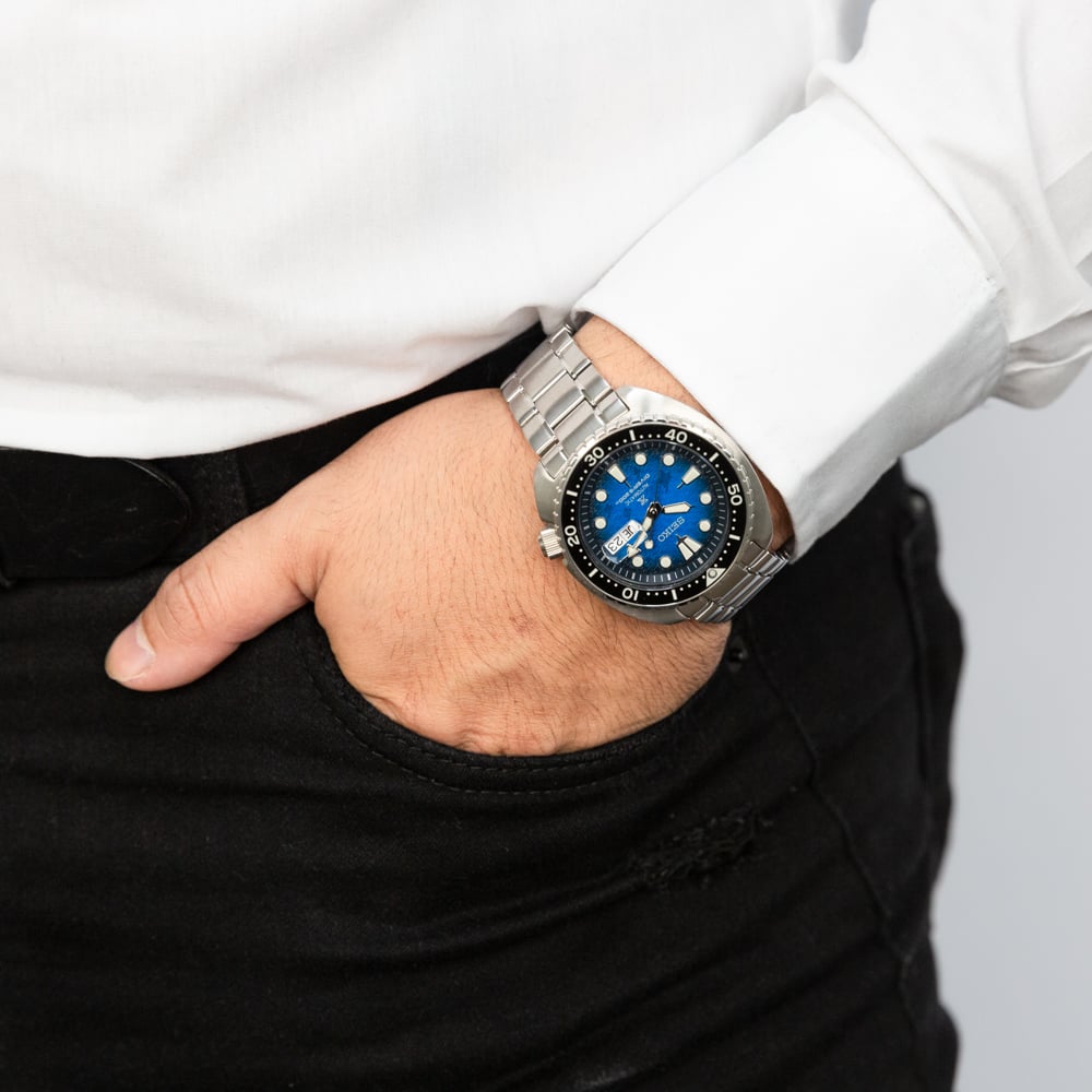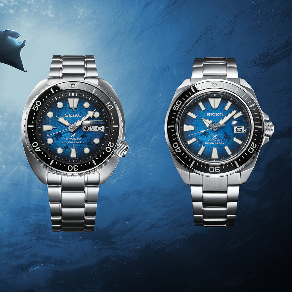 The Seiko King Turtle Prospex SRPE39K, part of the Save The Ocean collection, combines exceptional performance with a strong commitment to marine conservation. Its dial reflects the ocean’s view from the perspective of the endangered Manta Ray at 5 meters, with colours mimicking sunlight refraction and patterns symbolizing ocean waves. A portion of proceeds from this special edition supports ocean conservation efforts.