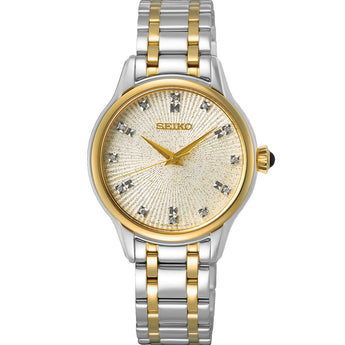Powered by the precise quartz Calibre 7N01 movement, the SRX550P ensures accurate timekeeping with the reliability of battery operation. Its cream-colored dial features a subtle sparkle effect and is adorned with 12 diamonds, adding brilliance and a touch of glamour.