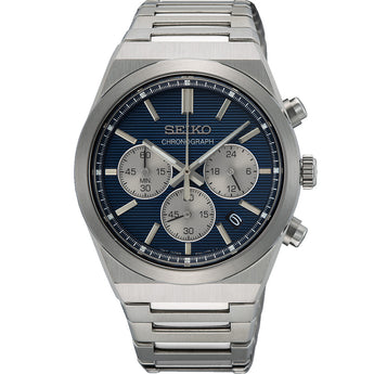 The Seiko SSB453P Chronograph watch showcases a textured blue dial with silver-toned hands and markers featuring LumiBrite luminescence. It includes chronograph minutes, seconds sub-dials, AM/PM indicators, and a date window, all safeguarded by scratch-resistant sapphire crystal glass. The 40mm stainless-steel case and matching band ensure durability and a cohesive design.