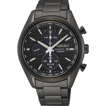The triple-sub dial chronograph provides precise time calculations, making it ideal for various activities. Encased in a durable stainless-steel case, the watch features a patterned black dial adorned with slim white hour baton markers and luminous hands, ensuring readability in any lighting condition.