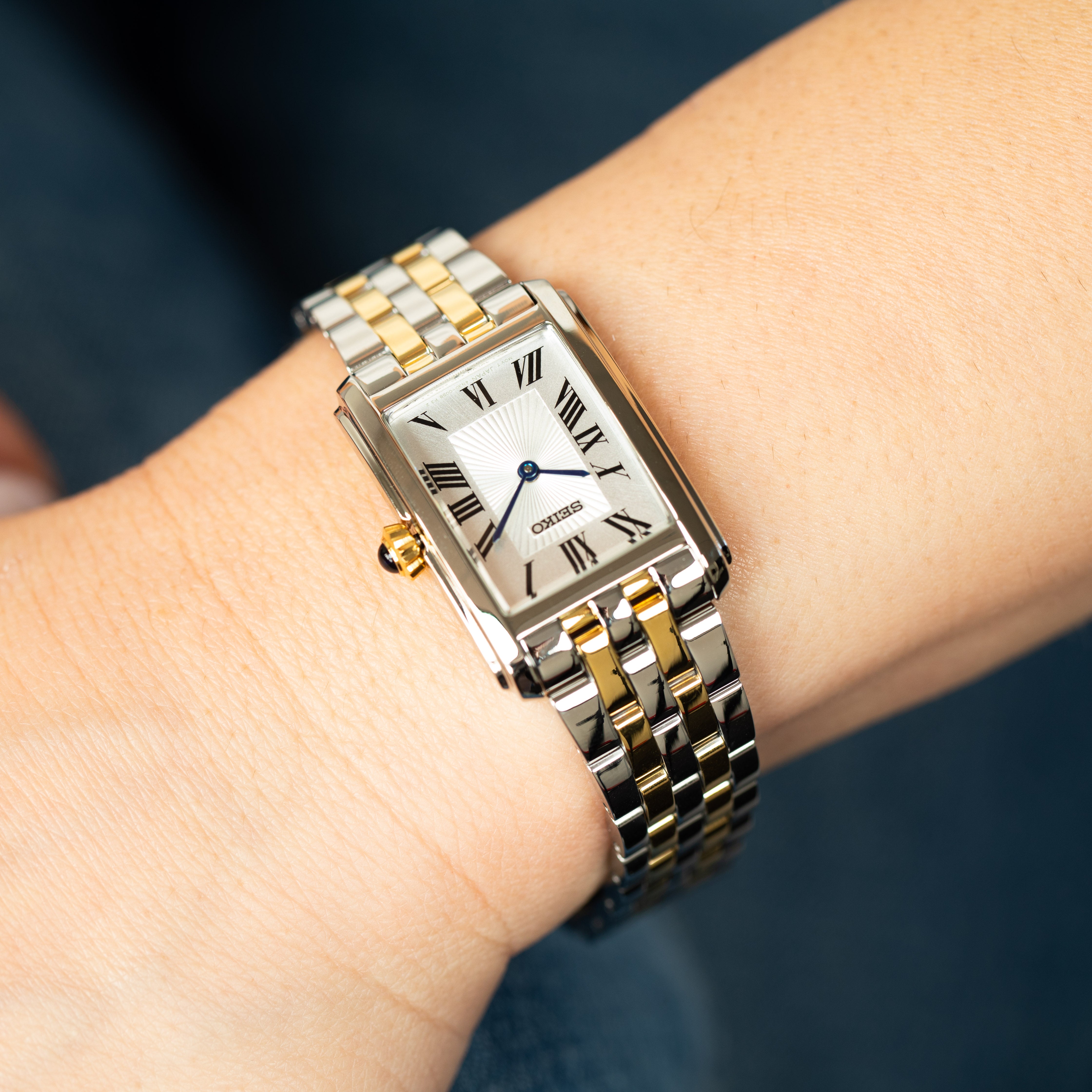 Powered by precise quartz movement, the watch ensures accurate timekeeping with an impressive accuracy of +/-15 seconds per month within a normal temperature range. The durable two-tone bracelet adds refinement to any attire, making it a versatile accessory for the modern woman.