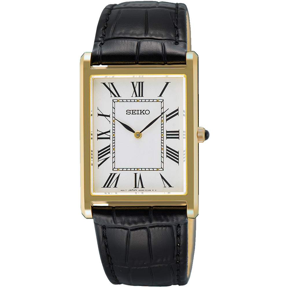 Paired with a black leather strap for a refined finish, this watch is powered by the dependable Calibre 4N30 quartz movement. With 50 meters water resistance, it blends vintage-inspired style with everyday functionality.