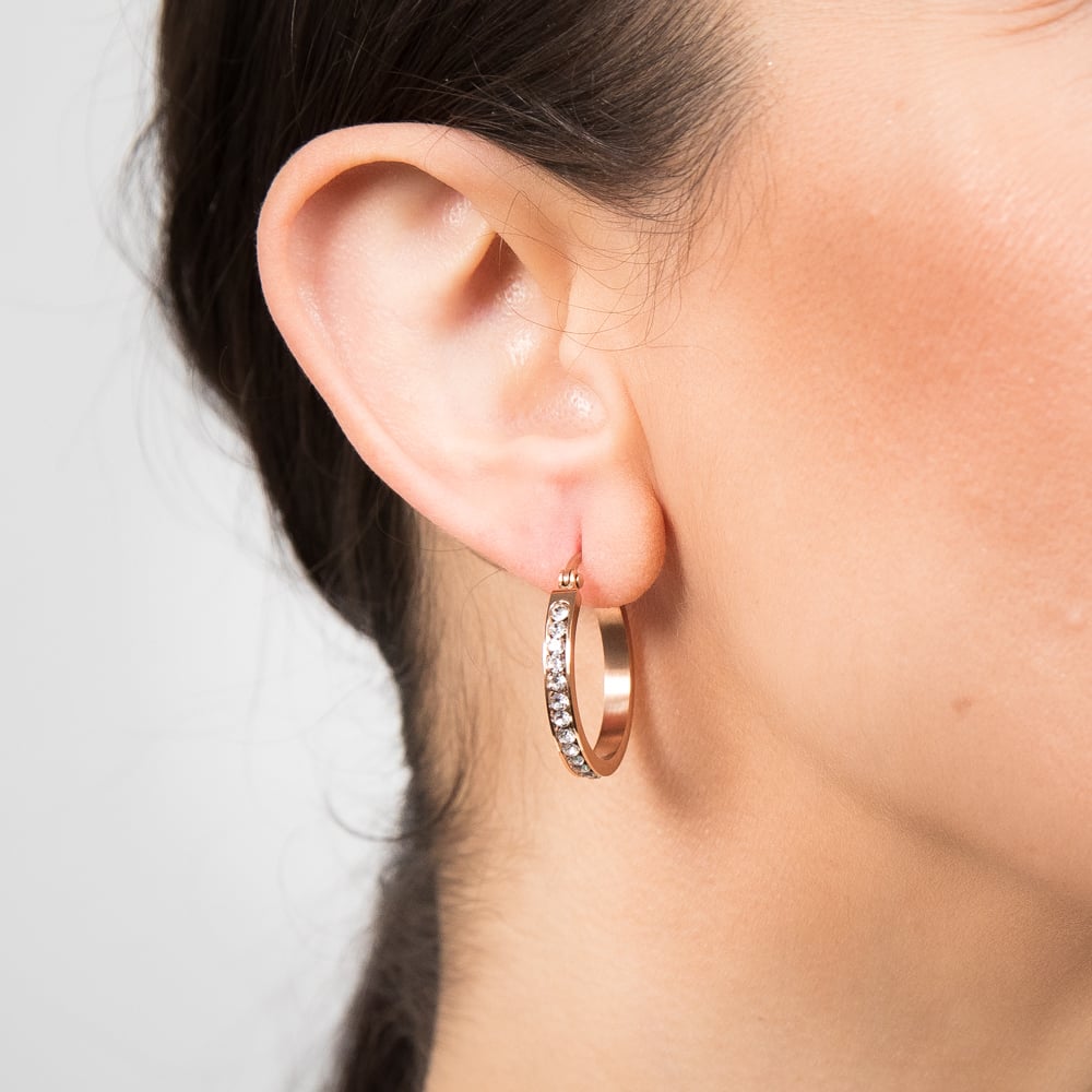 These stainless steel 25mm half-circle crystal hoop earrings are the perfect accessory for any occasion. The rose gold plating adds a soft, feminine touch, making this the ultimate flirty piece. The row of wintery white crystals will add glamour to your style, crafting the perfect blend of simplicity and drama. Add a touch of elegance to your ears and turn heads with this classic accessory.