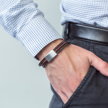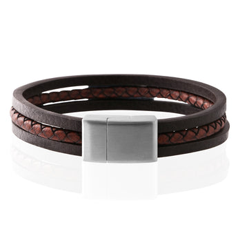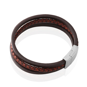 Stainless Steel 3 Band Woven Plait and Plain Strap Leather Bracelet