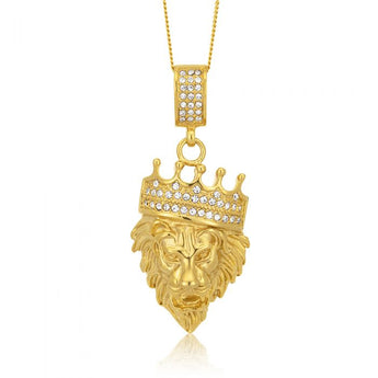 Stainless Steel and Gold Plated Crystal Lion Head with Crown Pendant
