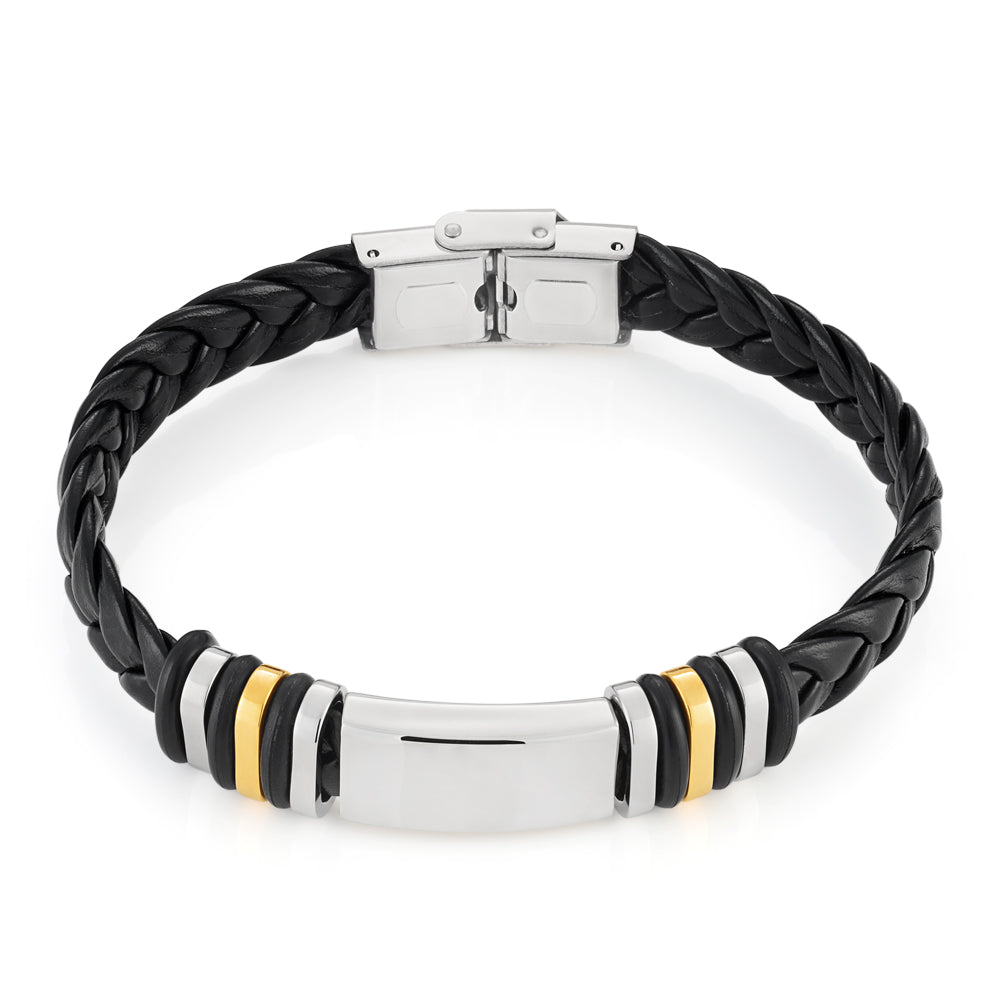 Stainless Steel Black Leather Gold Plated Gents Bracelet
