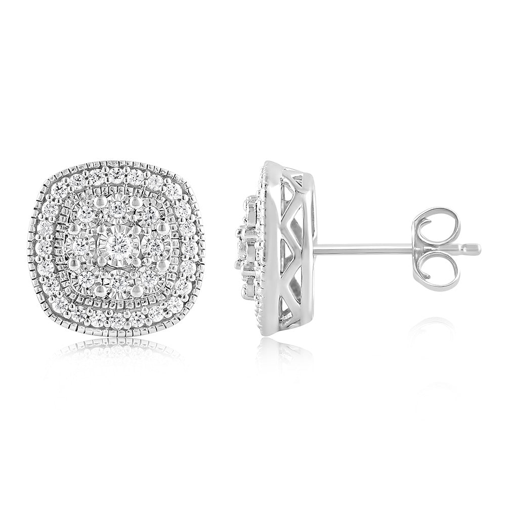 Sterling Silver 0.45 Carat Diamond Cushion Shape Cluster Stud Earrings with Round Brilliant Diamonds