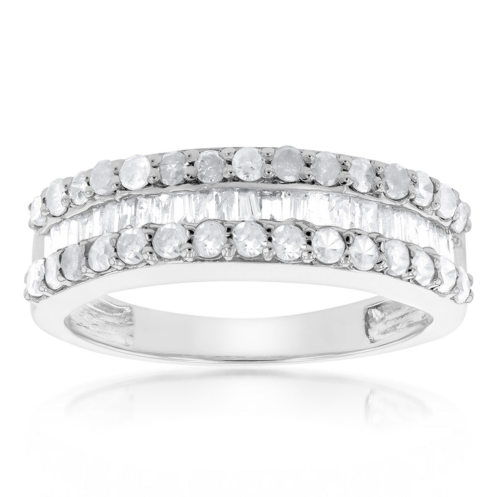 Sterling Silver 1.1 Carat Diamond Ring with Round Brilliant Cut and Baguette Diamonds