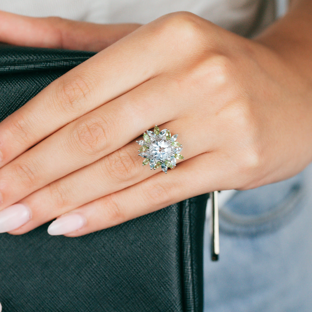Sterling Silver 2.41 Carat Sky Blue Topaz, 0.80ct Peridot & 6Diamonds Ring