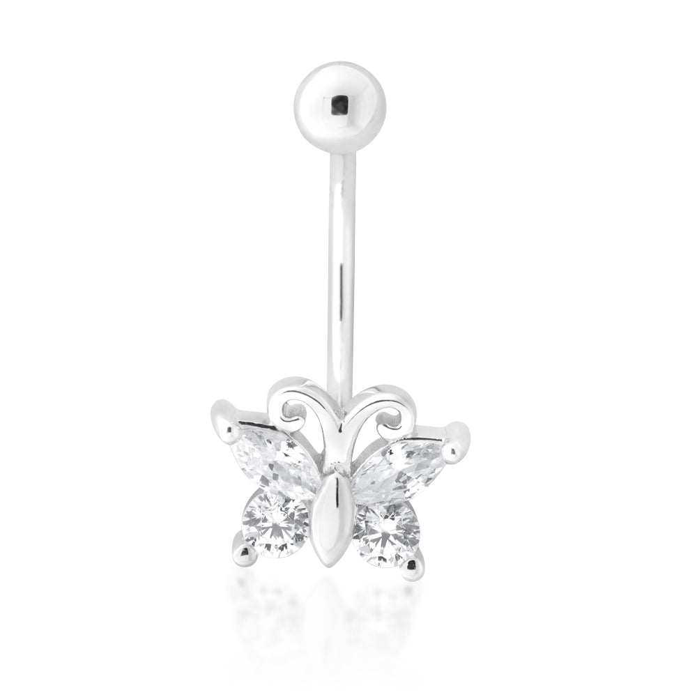 Sterling Silver Belly Bar Zirconia Butterfly Marquise + Brilliant Cut