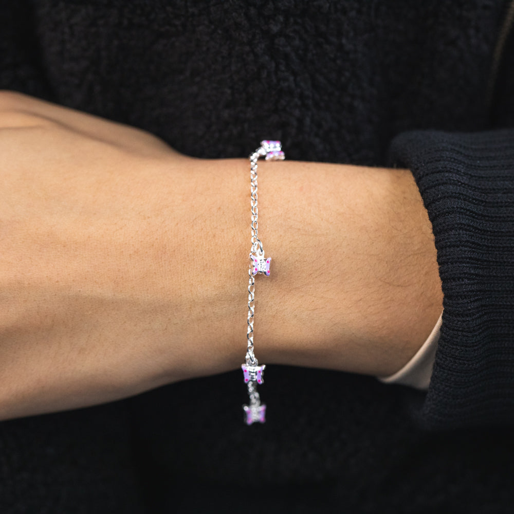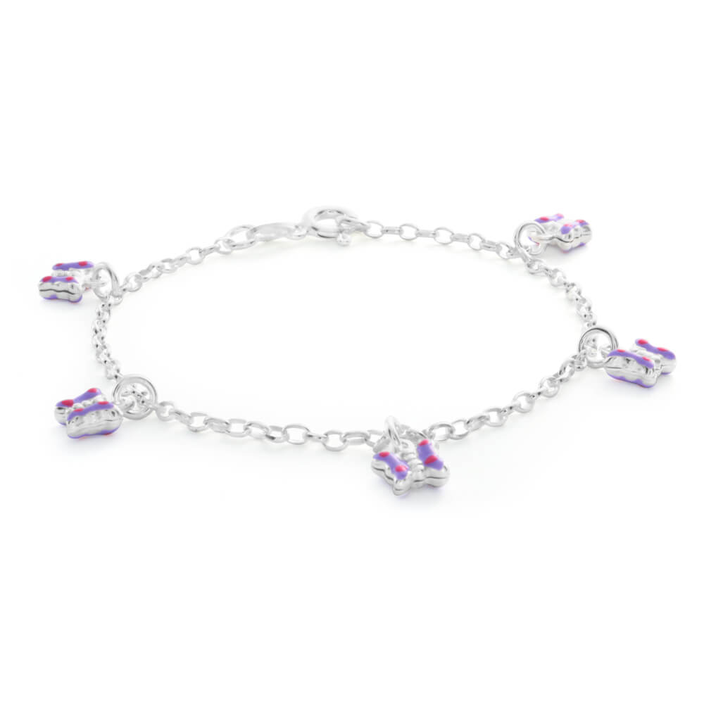 A cute gift for the nature lover, this sterling silver charm bracelet features adorable purple and pink butterflies. 16cm in size.