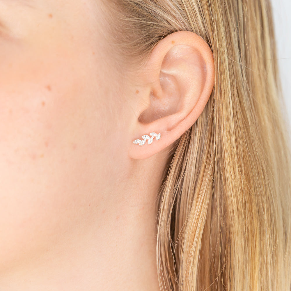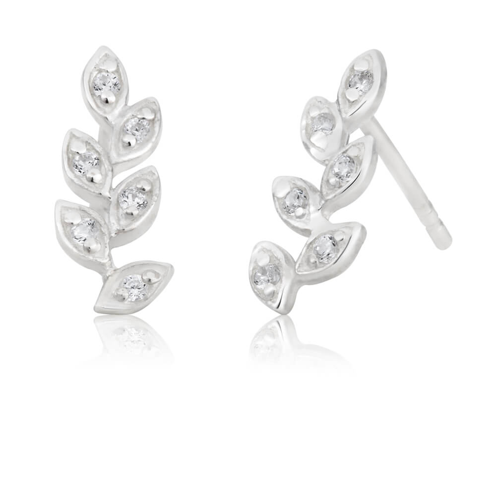 Sterling Silver Cubic Zirconia Leaf Branch Stud Earrings