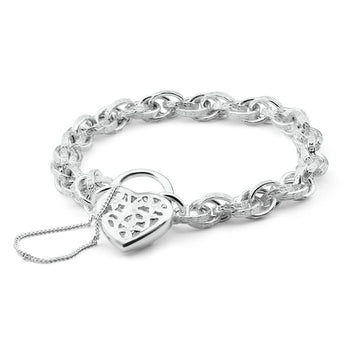 Sterling Silver Fancy Engraved Link Filigree Heart Bracelet