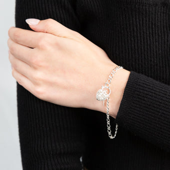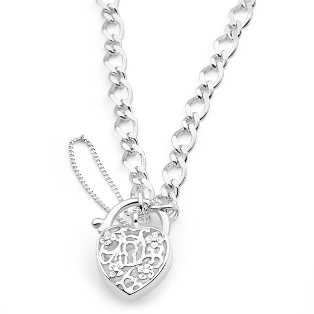 Sterling Silver Filigree Heart Figaro Padlock Bracelet