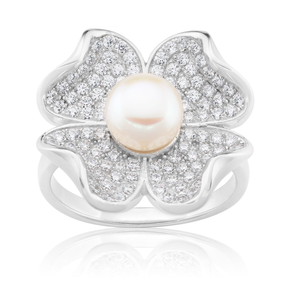 Sterling Silver Freshwater Pearl and Zirconia Flower Ring