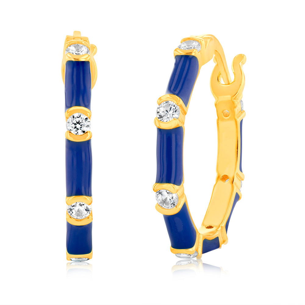 Sterling Silver Gold Plated Blue Enamel And White Zirconia Hoop Earrings