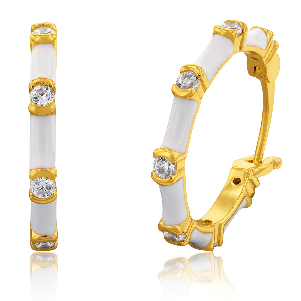 Sterling Silver Gold Plated Cubic Zirconia White Enamel Creole Earrings