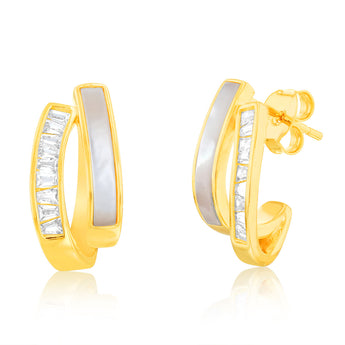 Sterling Silver Gold Plated Cubic Zirconia White Shell Pearl Half Hoop Earrings