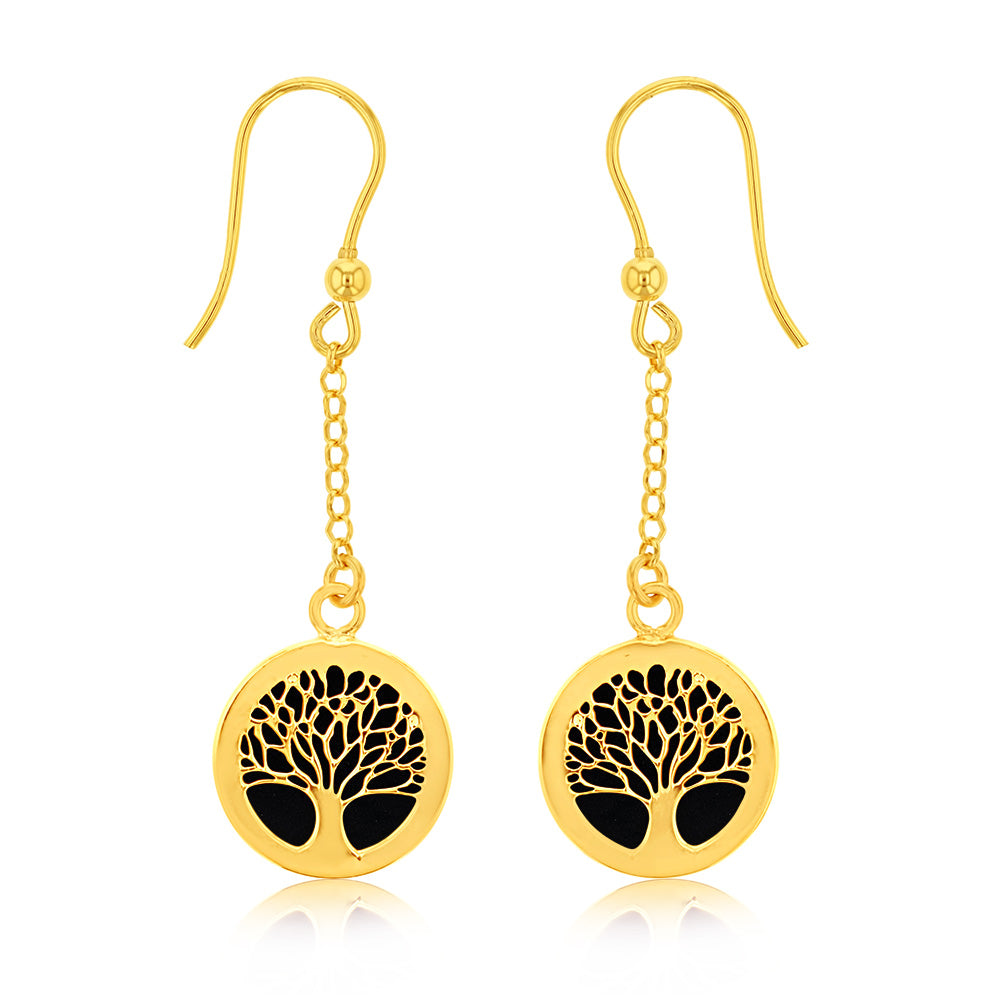 Sterling Silver Gold Plated Onix Tree Of Life Drop Earrings