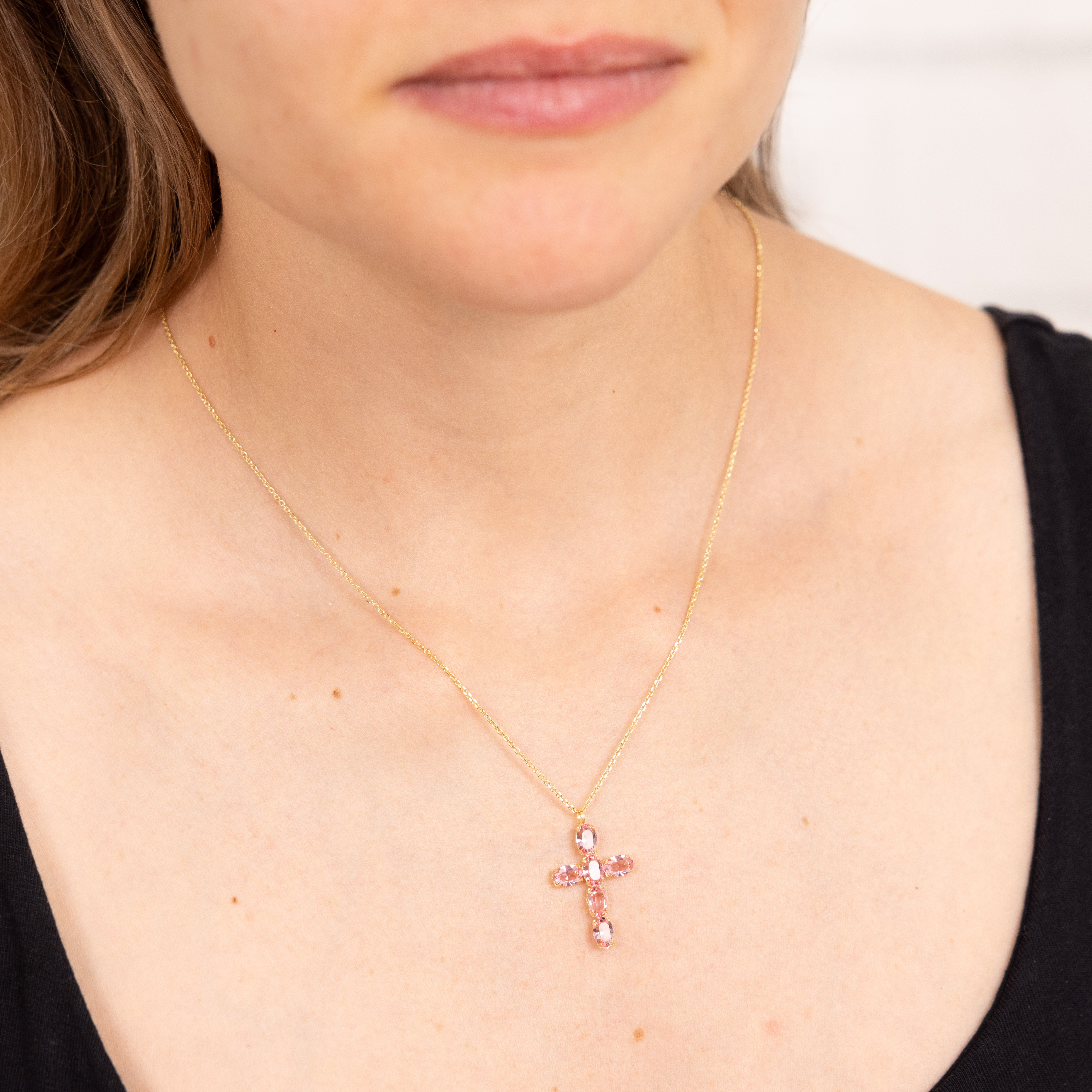 Sterling Silver Gold Plated Pink Crystal Fancy Cross Pendant On 42+3cm Chain
