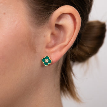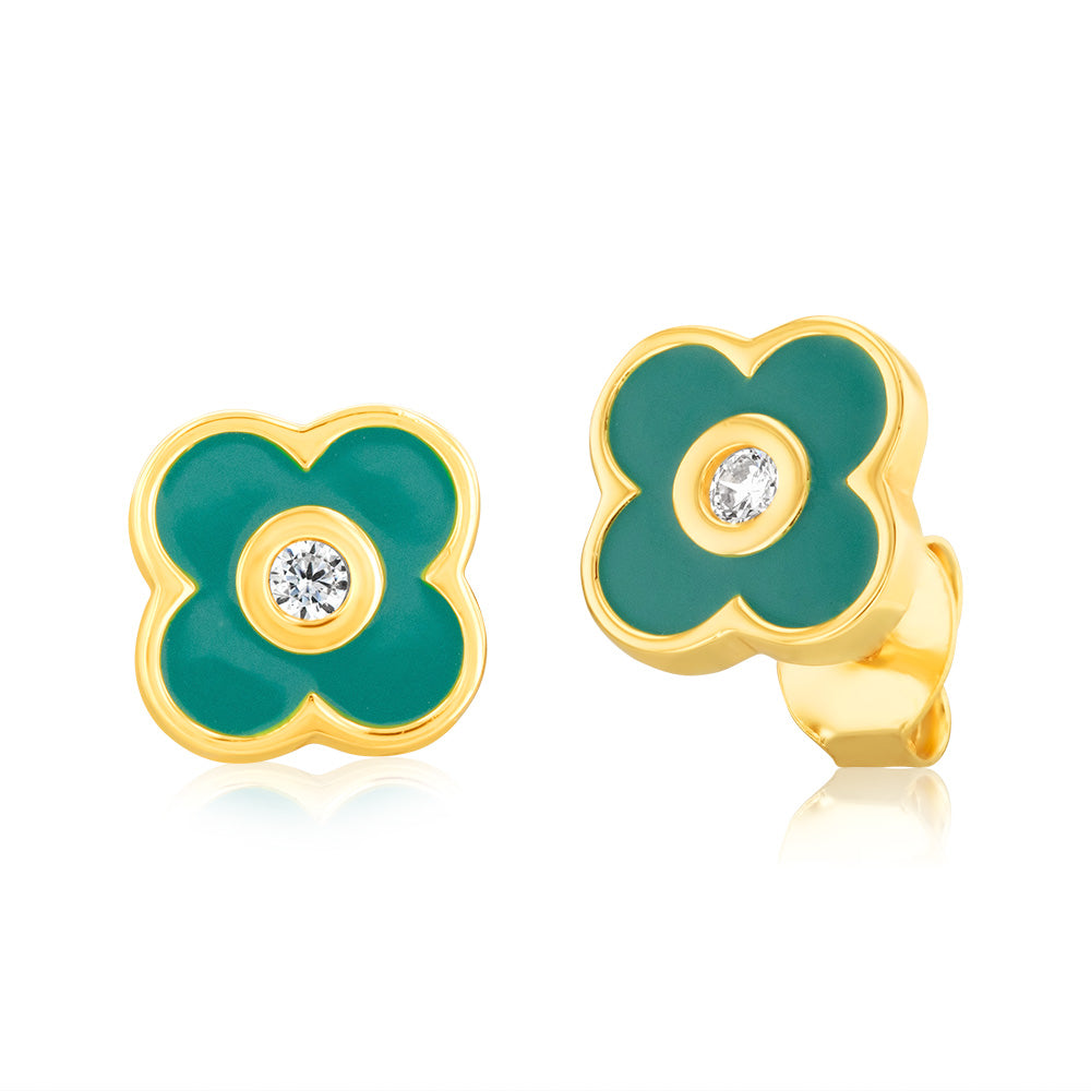 Sterling Silver Gold Plated Zirconia And Green Enamel Flower Stud Earrings