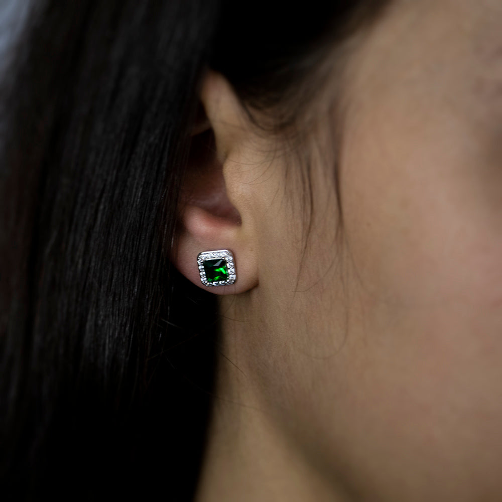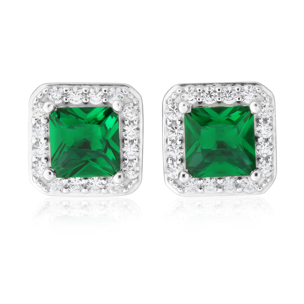 Sterling Silver Green and White Zirconia Cushion Cut Stud Earrings