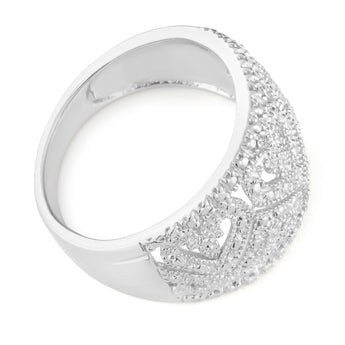 Sparkling with small diamonds, this sterling silver ring suits any skin tone and complements jewellery of other metals. This pretty ring is a gorgeous gift for a young woman, perfect for wearing out during the day or night. Comfortable to wear, the diamond ring will catch the sun to capture attention, drawing the eyes to the detailed and intricate hearts that embellish the width of the ring.