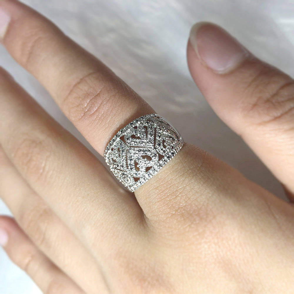 This statement diamond hearts ring is crafted from sterling silver and designed to be worn on the index, middle or ring finger of either hand. The wide ring design creates space for the intricately designed hearts. Positioned with the pointed side towards the centre of the band, the five full hearts sparkle with tiny diamonds, with two heart halves completing the design on each side.